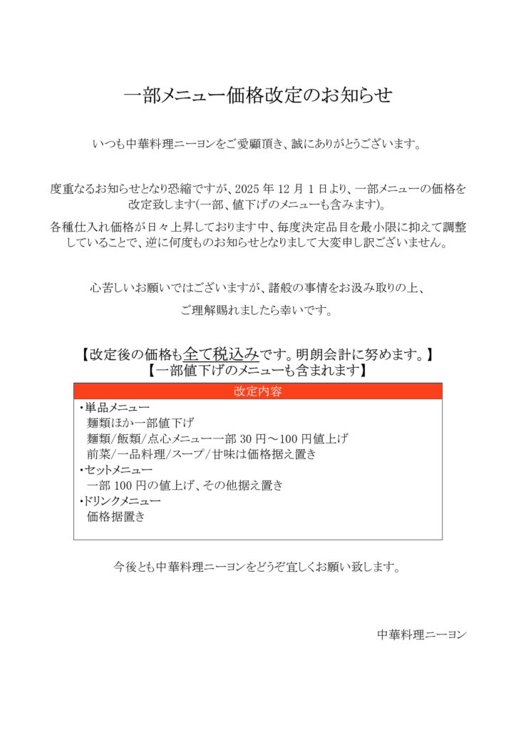 いつも中華料理ニーヨンをご愛顧頂き、誠にありがとうございます。