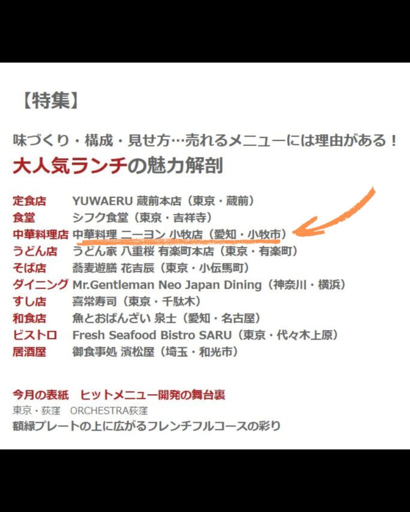 さて、この度、【近代食堂12月号】の「全国の大人気ランチ特集」にて、ニーヨン小牧店が取り上げられました。こうしてメディアに取り上げて頂くのも、ご贔屓にして下さる皆様のおかげです。いつもありがとうございます。